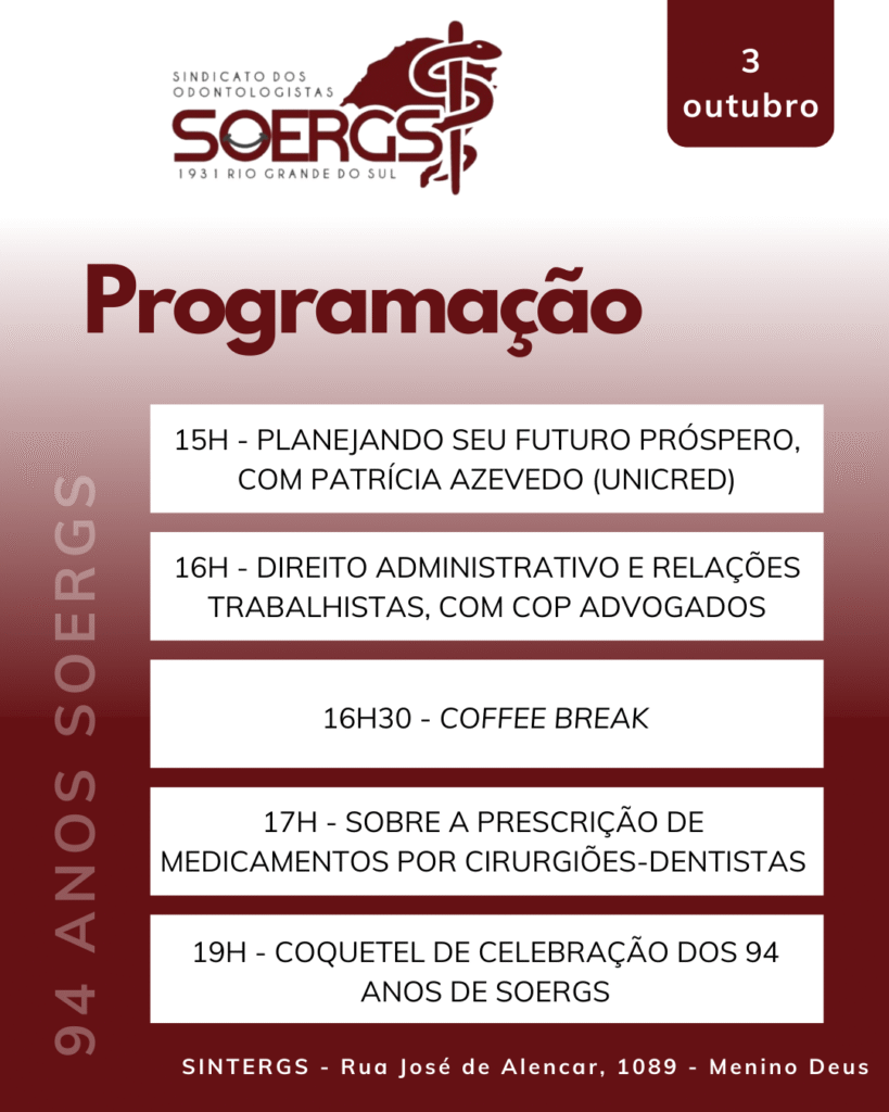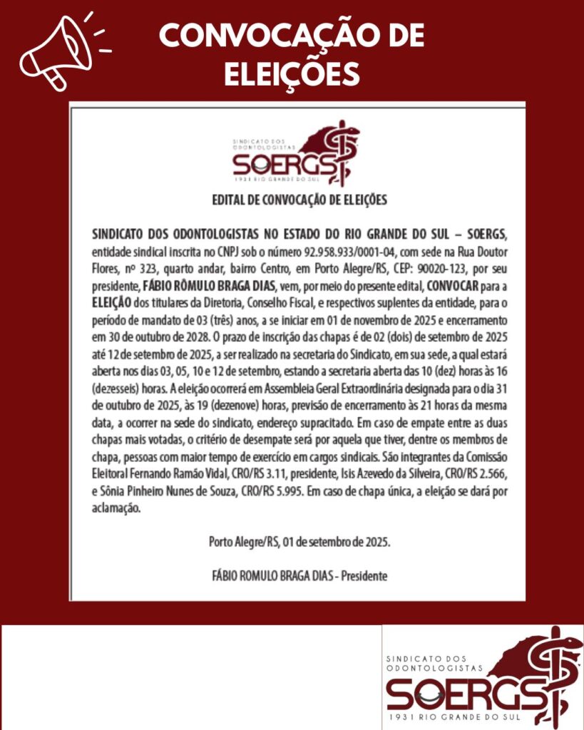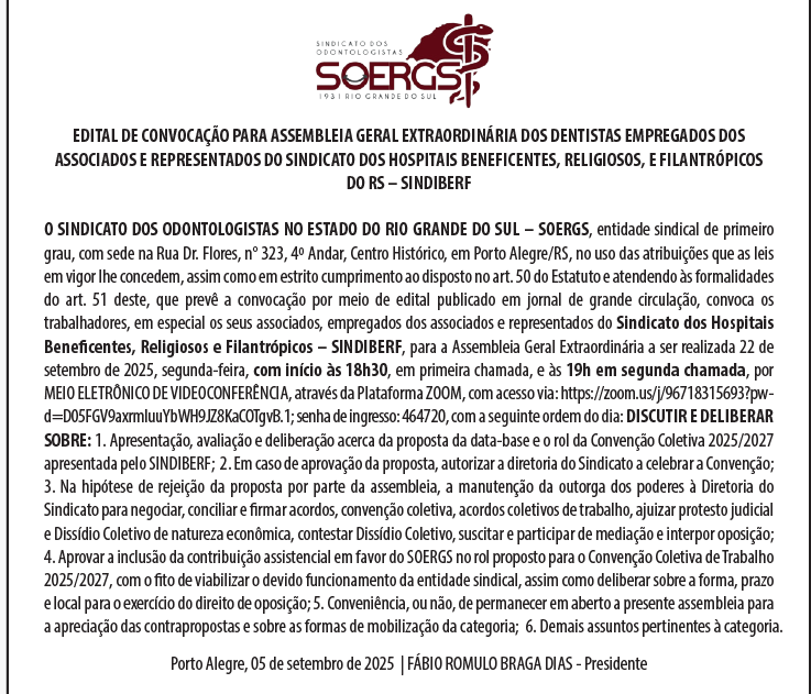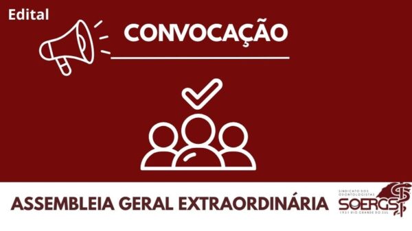 O SINDICATO DOS ODONTOLOGISTAS NO ESTADO DO RIO GRANDE DO SUL – SOERGS, entidade sindical de primeiro grau, com sede na Rua Dr. Flores, n° 323, 4º Andar, Centro Histórico, em Porto Alegre/RS, no uso das atribuições que as leis em vigor e o seu Estatuto lhe concedem, convoca os trabalhadores, em especial os seus
