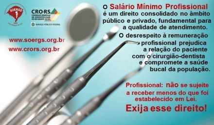 Conheça e divulgue os municípios que não cumprem as leis, o que caracteriza abandono da saúde pública, desrespeito aos profissionais da odontologia e à própria população que merece qualidade no atendimento. O Salário mínimo profissional é um direito consolidado no âmbito público e privado, fundamental para a qualidade de atendimento. O desrespeito à remuneração profissional prejudica a relação do paciente com o cirurgião-dentista e compromete a saúde bucal da população. Profissional não se sujeite a receber menos do que foi estabelecido em lei. Exija esse direito.