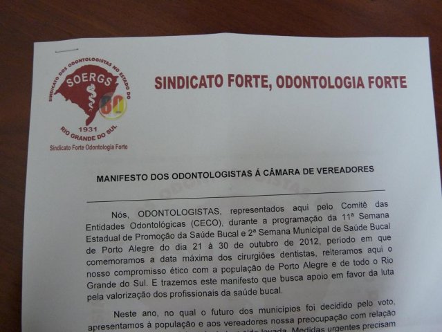 Nós, ODONTOLOGISTAS, representados aqui pelo Comitê das Entidades Odontológicas (CECO), durante a programação da 11ª Semana Estadual de Promoção da Saúde Bucal e 2ª Semana Municipal de Saúde Bucal de Porto Alegre do dia 21 à 30 de outubro de 2012, período em que comemoramos a data máxima dos cirurgiões dentistas, reiteramos aqui o nosso compromisso ético com a população de Porto Alegre e de todo o Rio Grande do Sul. E trazemos este manifesto que busca apoio em favor da luta pela valorização dos profissionais da saúde bucal.
