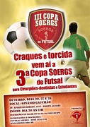 Vem aí a 3ª Copa SOERGS de Futsal Para Cirurgiões Dentistas e Estudantes. Não perca e participe, Inscreva logo o seu time. Mas treine bastante, pois a equipe campeã da 2ª Copa SOERGS, diz: “Está tudo dominado”, e promete arrasar novamente. Este ano teremos nova formatação do evento, com jogos preliminares e a grande decisão, em dias separados. Veja a seguir a programação e as fotos do ultimo evento.